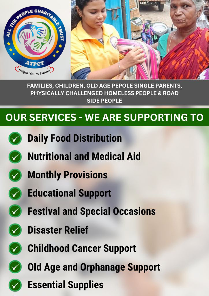 ALL THE PEOPLE CHARITABLE TRUST is supporting to underprivileged children in our organization has children by providing healthy foods to avoid malnutrition & supporting to their education. Supporting to the old age home, special children orphanage to Andhra, Telangana, Chennai and stepping into other states.